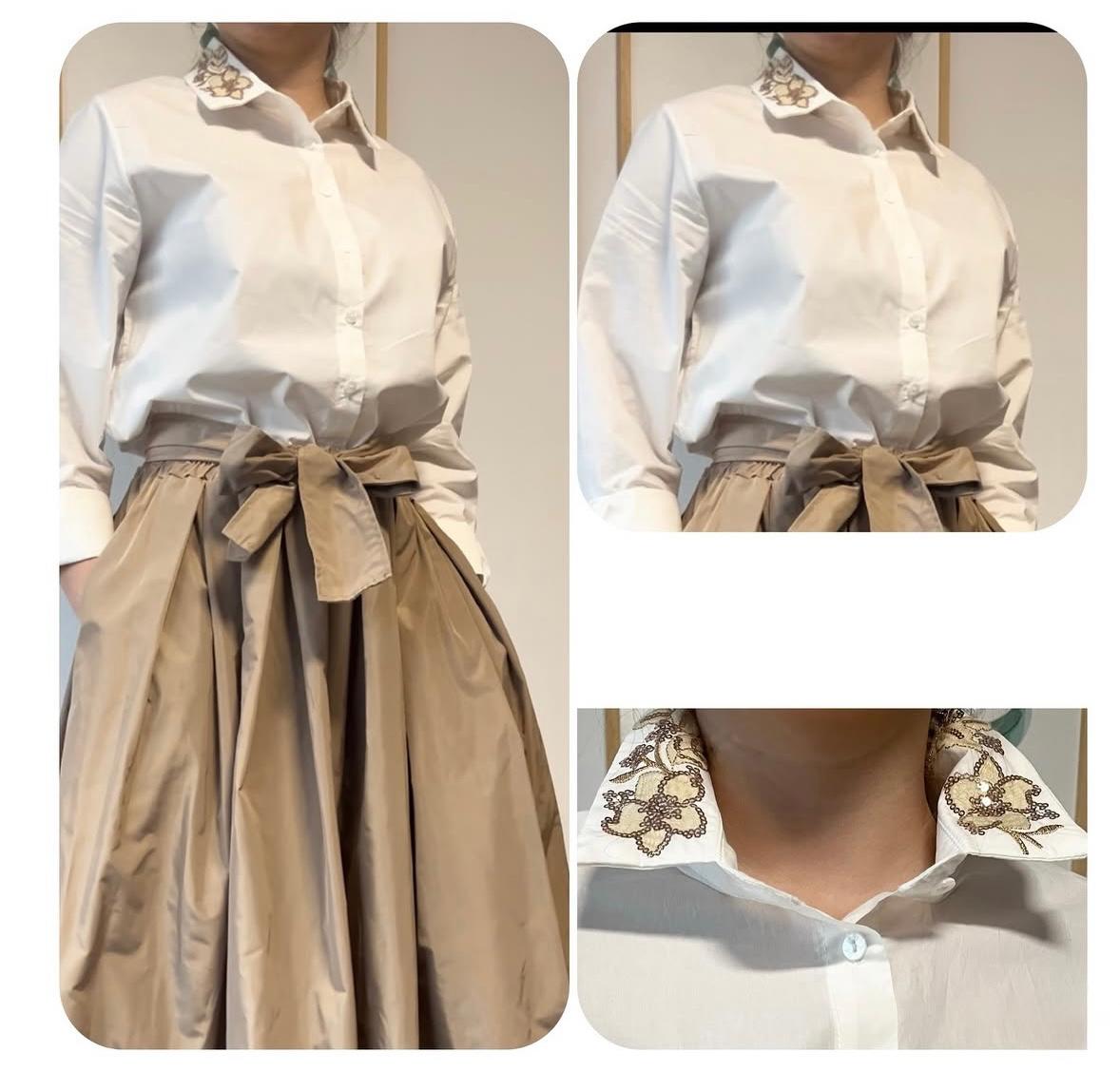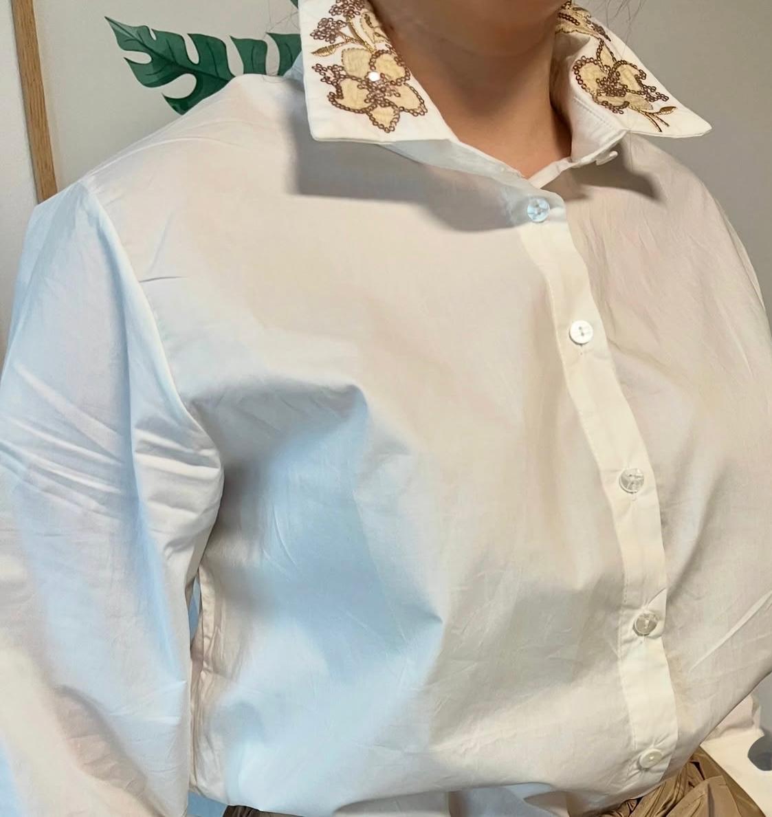 Clásica con un toque sofisticado. Esta camisa blanca eleva cualquier look gracias a su cuello delicadamente bordado en hilo dorado, que aporta elegancia y un aire distintivo sin perder la versatilidad de una prenda básica.