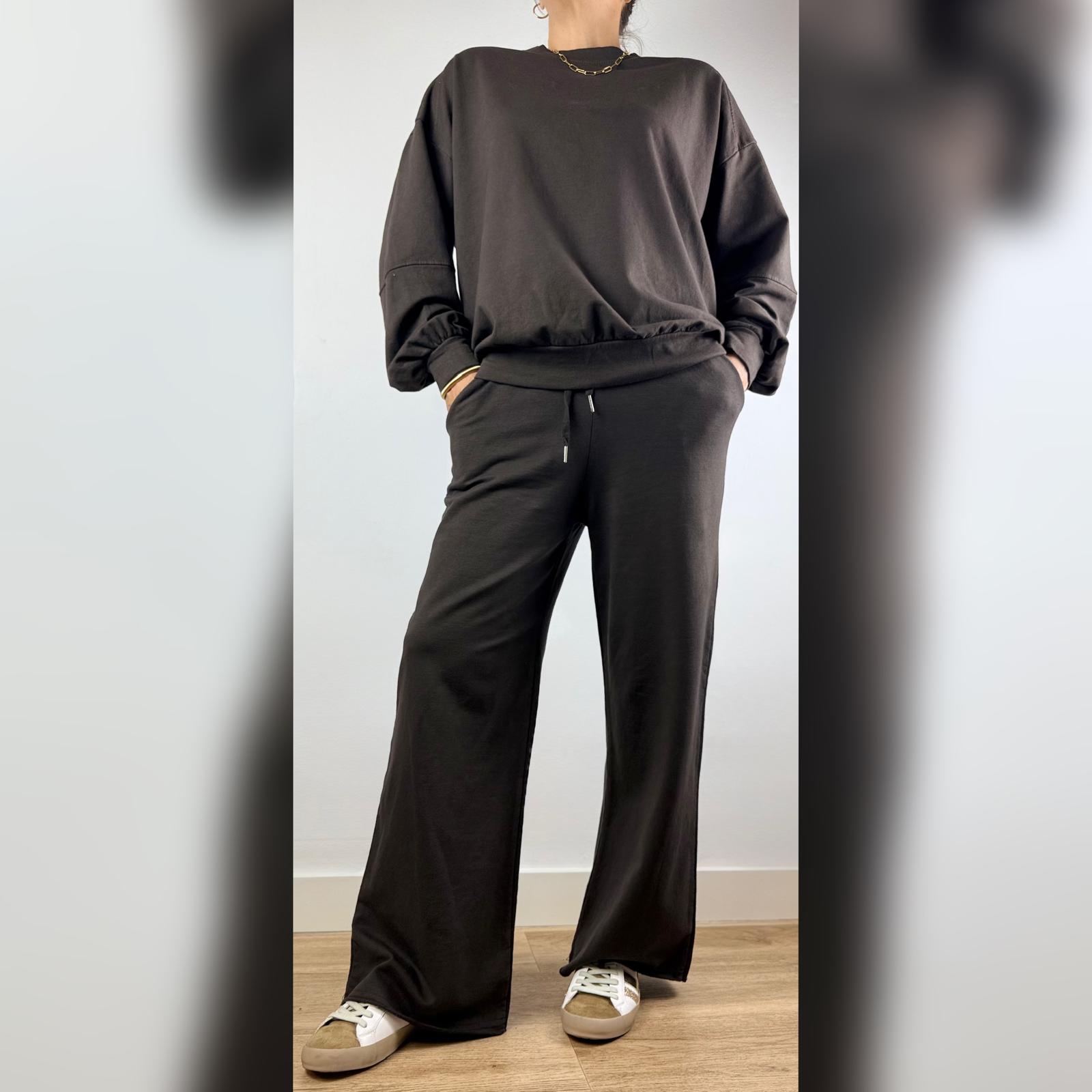 Nuestro chándal de mujer está confeccionado en algodón suave y transpirable, ideal para ofrecer el máximo confort sin renunciar al estilo. El conjunto incluye un pantalón de pata ancha, que aporta un ajuste moderno y favorecedor, con bolsillos funcionales para mayor practicidad. La sudadera básica de corte sencillo lo convierte en un imprescindible versátil, perfecto tanto para estar en casa como para un look casual urbano.
