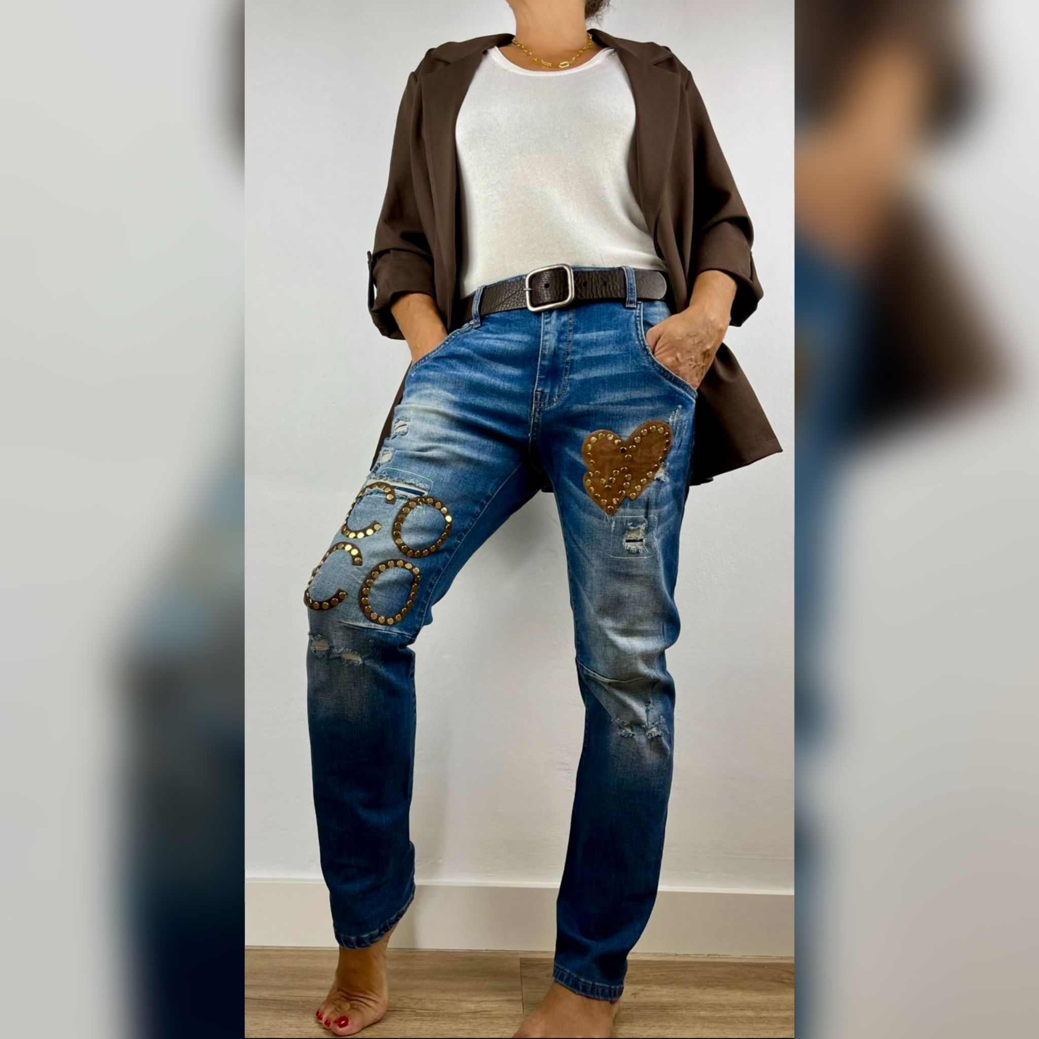 Este pantalón tejano combina el estilo  denim con un toque sofisticado y original. Decorado con tachuelas y delicados bordados en tonos chocolate y dorado, aporta un aire elegante y moderno que transforma cualquier look.